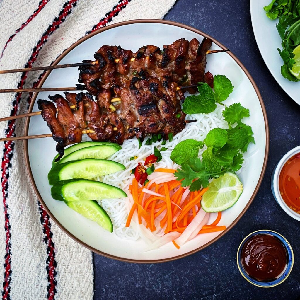 •  Bun Bowl Rice noodles with sizzling garlic pepper Beef and Vietnamese pickles.